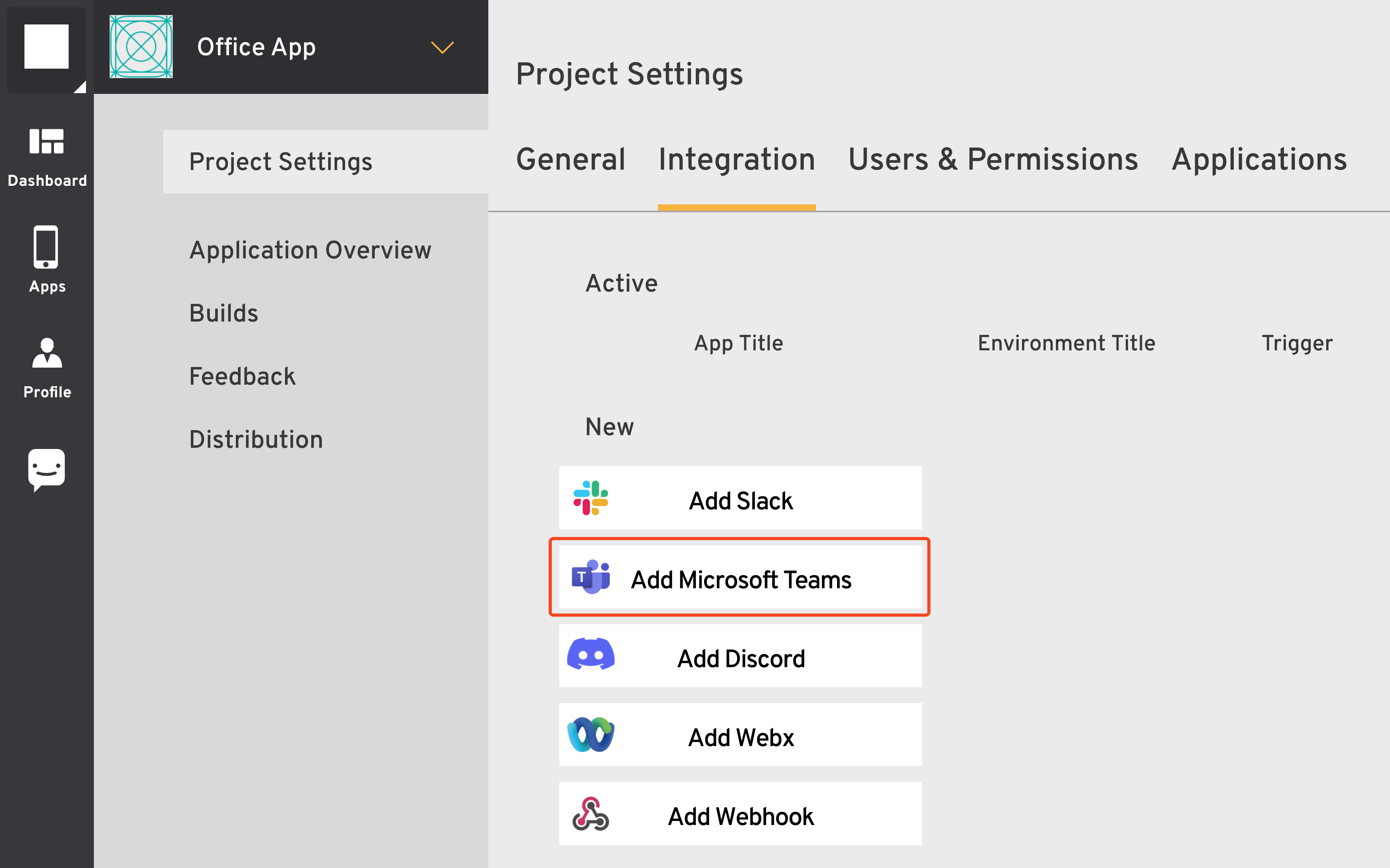 2. Go to the *Integration* tab and add a Microsoft Teams Integration.&#x20;