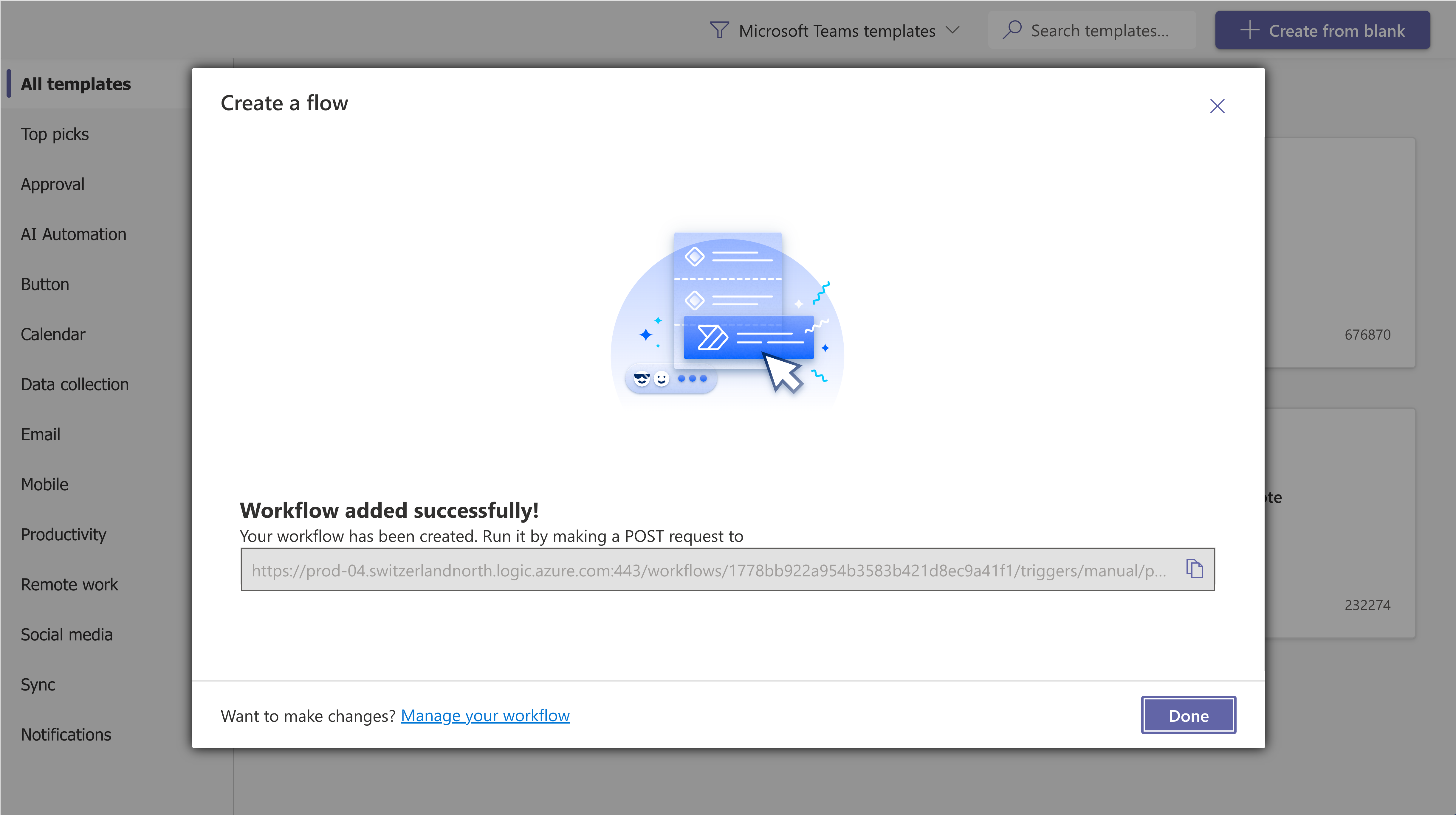 6. Select your Teams Team and Teams Channel in which you want to post a message. Press on *Create a flow.*&#x20;