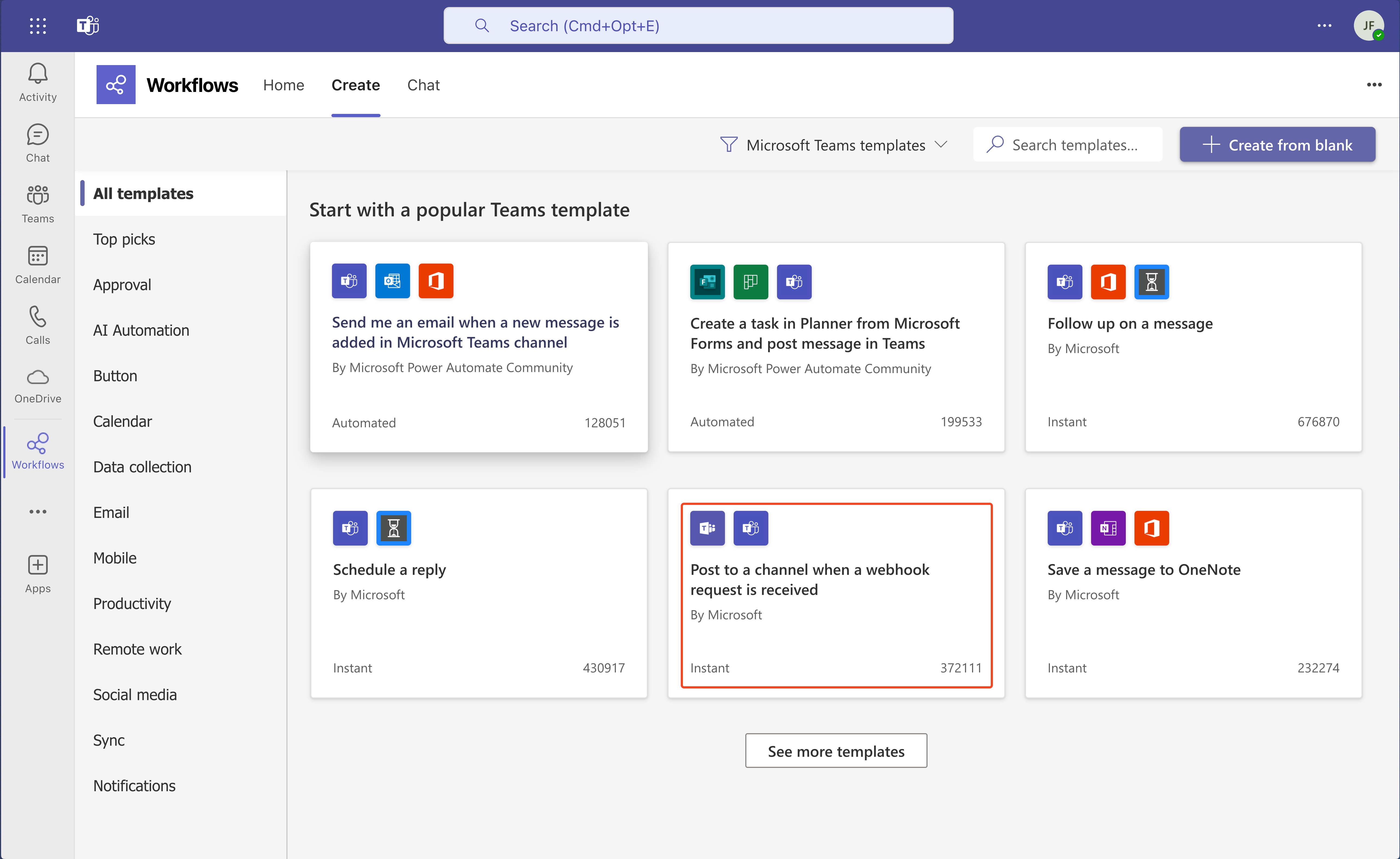 3. Then you can press on *New flow* and ether use the *Post to a channel when a webhook request is recieved* or create a flow from blank.&#x20;
